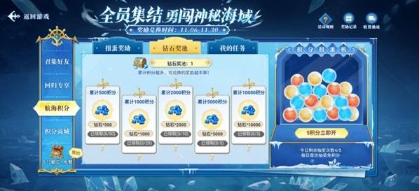 每日还可参与积分扭蛋抽奖,奖池内含正版库赞手办、航海王冰箱贴盲盒以及最高12万钻石的超级大奖!通过完成任务积累积分,即有机会将这些珍稀奖励收入囊中。