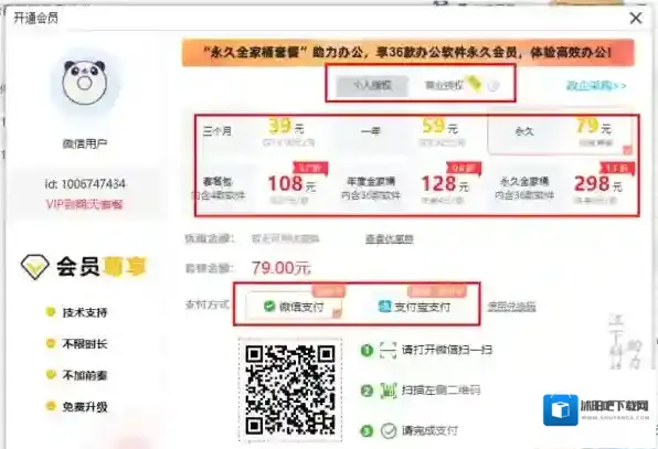 3、接下来会弹出一个二维码,我们使用手机微信扫描,进入到会员开通页面,会显示多个套餐,我们看到其中分为“个人授权”和“商业授权”两类套餐。