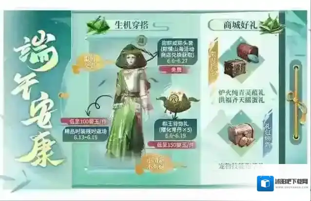 ,粽王背饰礼、炉火纯青灵蕴礼、洪福齐天摇蛋礼全新上线!同时,将会永久下架宠物技能稳健礼,替换为宠物技能饱学礼。此外(6月13日),往期精品时装–绿柳春、春色撩也会迎来特价返场哦~