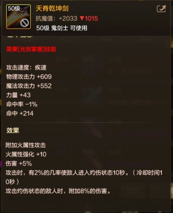 天脊乾坤剑附加火属性攻击火属强+10伤害加5%,2的概率敌人进入灼伤状态攻击灼伤附加8%伤害,想让剑魂展现华丽选这把,注:世界领主火抗高伤害有点折扣,团本火抗低打团有奇效。