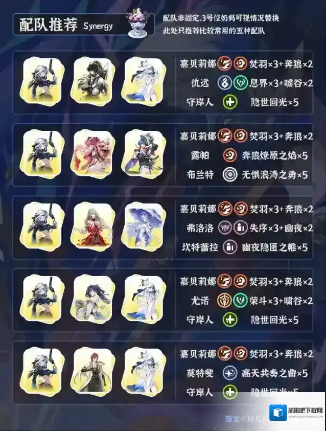 ⑤嘉贝莉娜因为主要是声骸伤害,根据声骸套装与版本规律推算,与仇远最为搭配,仇远声骸也是猜测。无仇远最佳队伍是嘉贝莉娜+露帕+布兰特的新三火队,露帕加成非常不错,布兰特提供部分输出。如果没有布兰特,可以换成守岸人/莫特斐/长离等。除了露帕,嘉贝莉娜也可以搭配尤诺/弗洛洛/莫特斐等重击加成角色。
