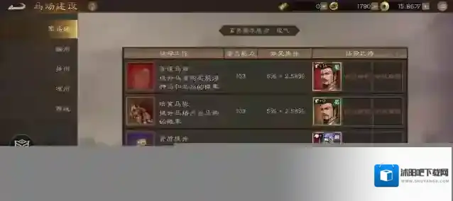 关于马场的建设,可以任命武将去负责不同的项目,可以帮我们提升马场出产稀有品质的几率。这里面额武将卡,15星和5星效果是一样的!所以我们可以多屯一些特定普通的5星卡,比如徐晃,来增加一些几率。吃果培养武将的能力也很有用的哦!