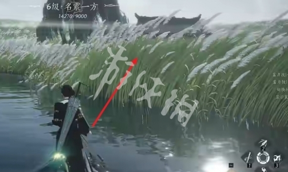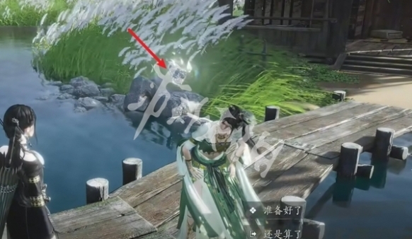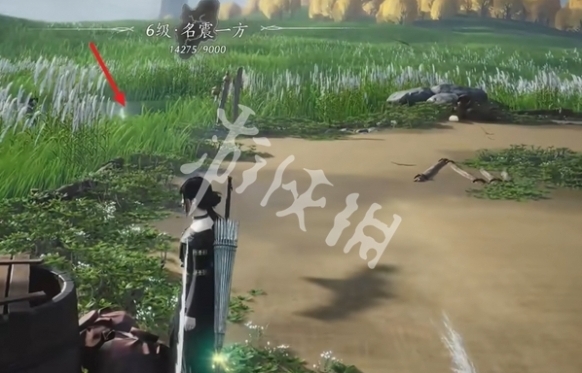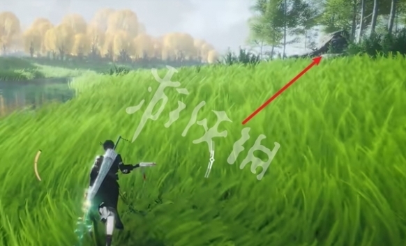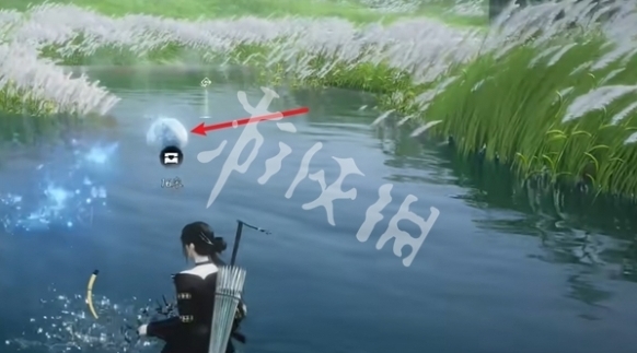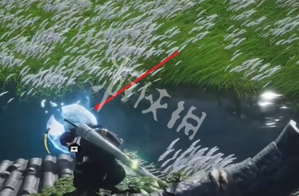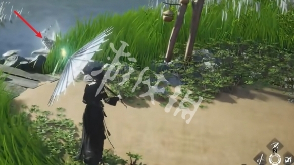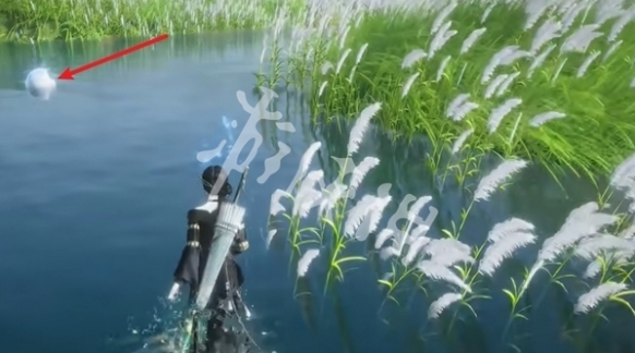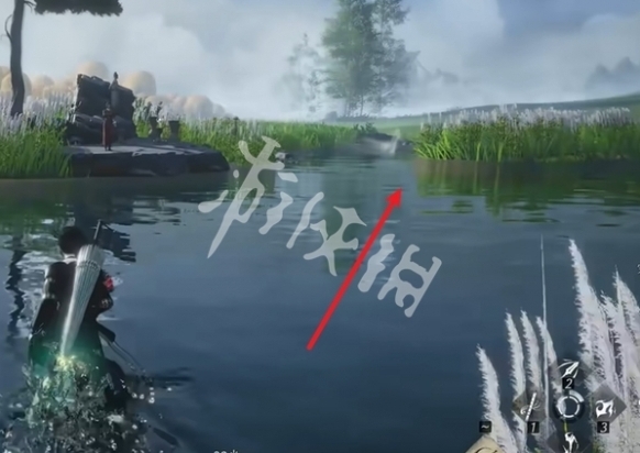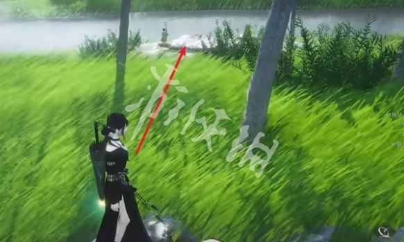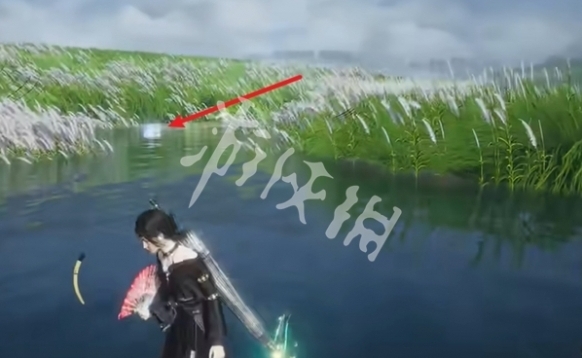 3、走到图中的位置,往箭头处走,即可看到水中有个宝箱。