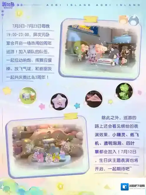 奥比岛3周年庆典将于7月3日正式开启!全新版本即将重磅登场,灵感创想家带来全新联动装扮,全新3d场景和共建街区玩法即将上线,周年庆「狂欢之星」热力来袭,五款周年派对游戏等待小奥比们加入狂欢,更有周年庆华服和晶钻等超多免费福利等着大家!