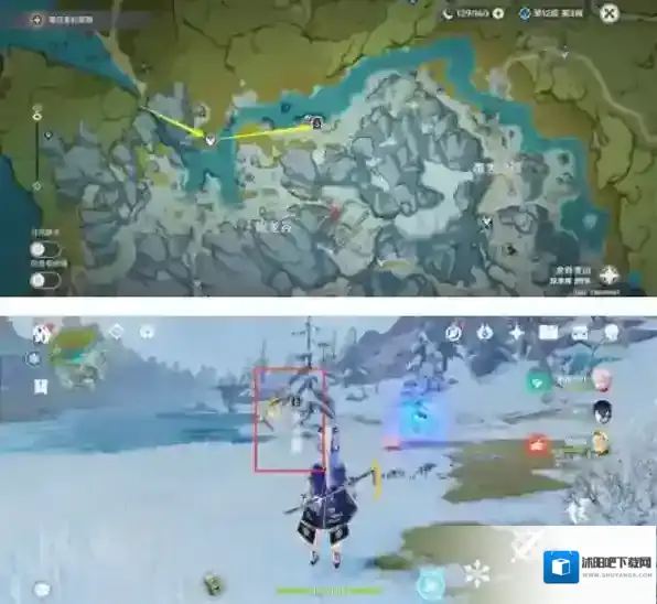 如图所示,来到图传送瞄点,然后向东走,穿过河流: