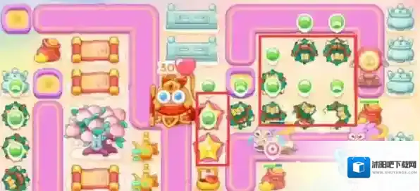 3、然后继续将附近的道具清完,中间放置星星防空,如图所示。