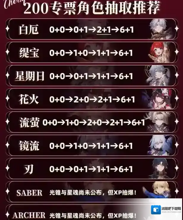 抽卡推荐:白厄 缇宝 星期日 花火 流萤 镜流 刃,Saber和Archer目前还没出,想抽取的可以等之后再抽