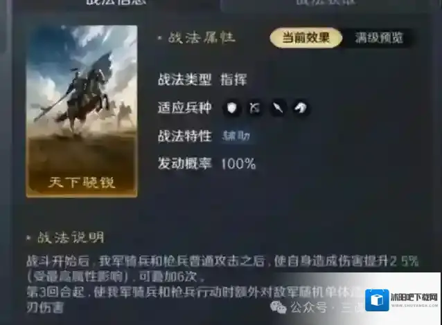 自带战法天下骁锐,骑兵、枪兵追击体系辅助,可以提供增伤。