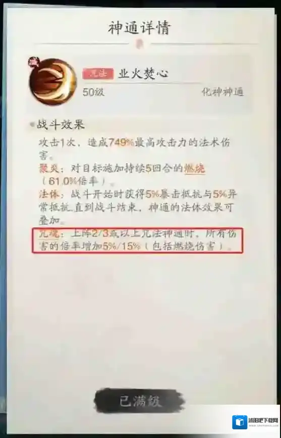 神通推荐:中期可以选择:5阶业火焚心、5阶混元一气、5阶离火炙焰、6阶幽冥绝影、7阶封天神炎,后期可以将离火炙焰换成7阶天鼓引雷,这样就每个技能都能带有燃烧效果,伤害更高。