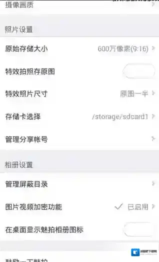 3、滑动设置界面至最下方,大家可以看到相册这个选项里面有一个在桌面显示魅拍相册图标的功能,点击其功能右侧小圆点按钮,如下图。
