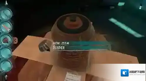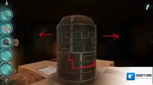 我们要将卡扣插入圆柱体外面的轨道槽中,通过轨道移动到下图中红框区域,这样就能刚解除机关了。
