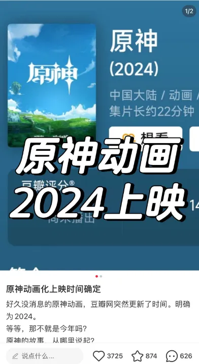 有网友发现,在豆瓣网的《原神》动画项目的页面上,上面赫然写着首播时间为2024年。因此,有不少网友发帖讨论,豆瓣网的消息靠谱吗?原神动画是否真的会在2024年上线?不过还是得告诉大家,仅凭借豆瓣网的显示的这个时间,并不代表真的2024就播出,一切还是要以官方发布的通告为准。但是比较遗憾的是,目前原神动画的官方账号“原神动画项目”,仅仅在2022年的时候发布了2条内容,后续就没有进行过任何更新了。以至于不少玩家每天还在下面留言,希望官方可以及时同步一下最新的进度和进展。