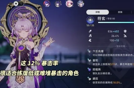 2、符玄能够提升我方角色6%生命值和12%暴击率,并且为队友分摊伤害,同时降低18%受到的伤害。