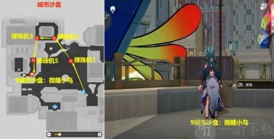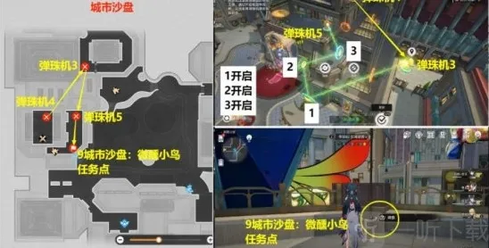 (4)接着从弹珠机4飞回到弹珠机3去,接着将弹珠机3重置一下后,飞到弹珠机5位置去,然后先去下图位置调查一下,触发9城市沙盘:微醺小鸟贴纸的任务