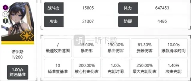 诺伊斯的基础攻击可对目标造成攻击力的61.3%伤害;蓄力时间为1秒,满蓄后伤害提升至250%,核心命中额外造成200%核心伤害。