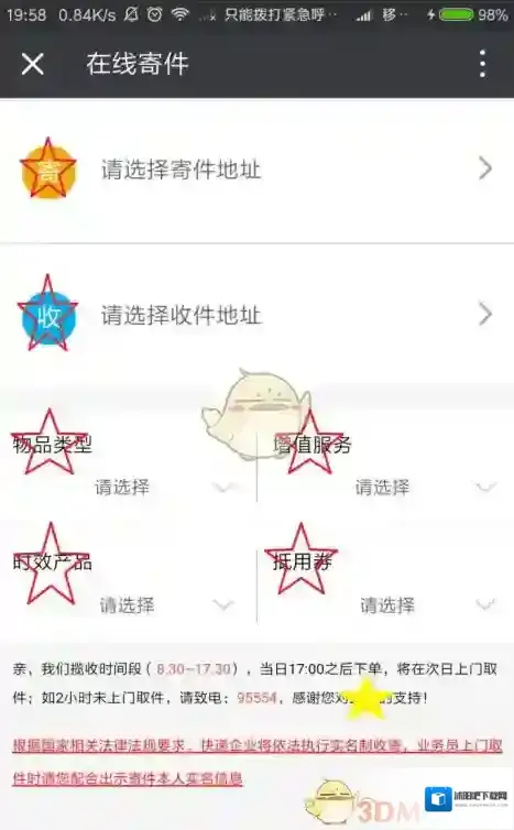 4、进入之后就是“在线寄件”的页面了,在这里需要小伙伴们尽量准确的填入各项信息哦,千万不要填错了,而且每一项都是需要选择的。确认无误之后,方可点击“提交”。提交时,需要在线支付预估好的寄件金额哦~