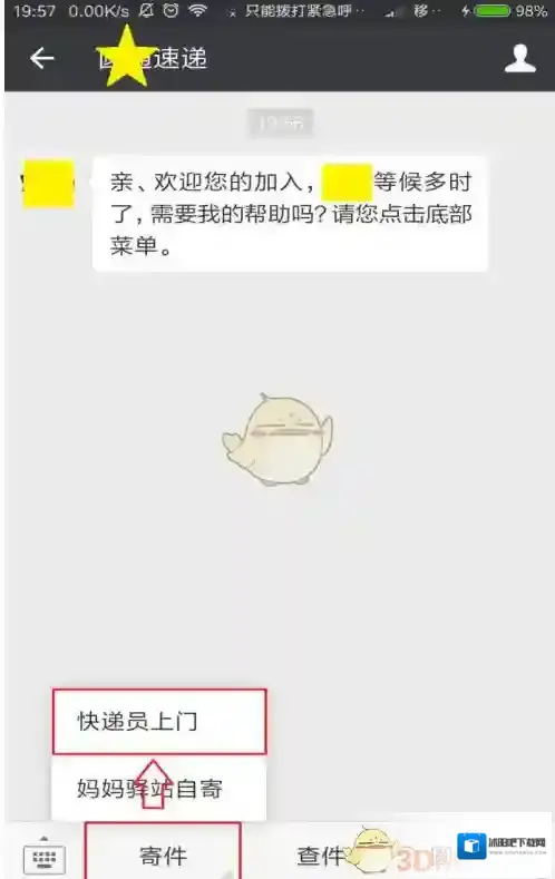 3、关注了公众号以后会自动进入聊天界面。此时,找到左下角“寄件”的选项,点击打开会出现两种寄件方式,在这里,小编选择了第一种:快递员上门寄件方式。