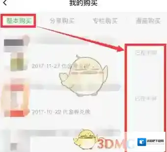 7、在我的购买里面可查看到,购买成功后它会自动下载到书架里。在左边显示的兑换书的日期。