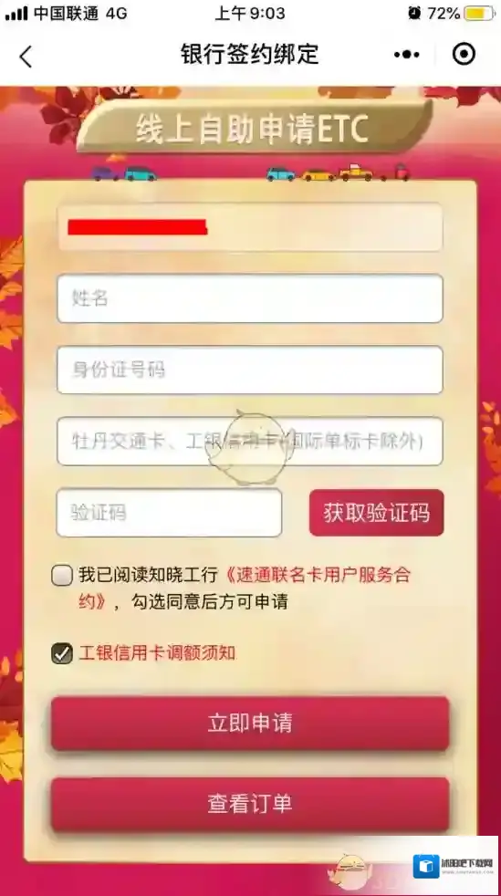 5、最后就来到了线上自助申请ETC页面了,在这里我们输入绑定好相关信息后,点击最下方的“立即申请”,即可成功完成货车ETC的线上办理。