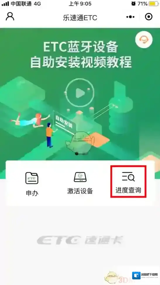 6、如果用户想要查询ETC的办理进度,可以在“乐速通ETC”的小程序首页,点击“进度查询”,如下图: