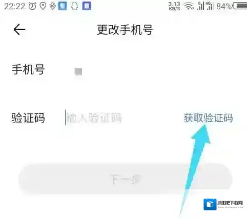 6、在打开的更改手机号界面,点击获取验证码并填写上去,再点击下一步即可。