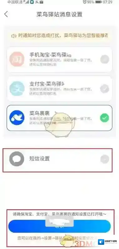5、可以看到已经成功设置菜鸟驿站短信通知了,如下图所示: