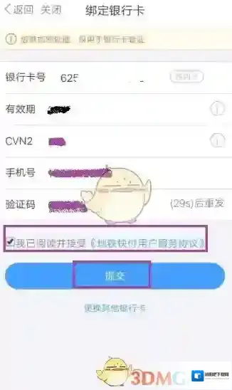 5、银行卡卡号输入完毕后点击下一步,进入到卡片的详细信息填写页面,在页面上填写正确的卡片信息,然后勾选同意地铁快付用户服务协议,再然后点击“提交”,即可完成银行卡的绑定。