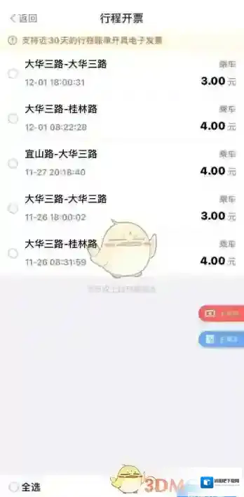 注意:进入开票行程页,显示用户当前快付渠道扣款时间为近30天的乘车消费账单