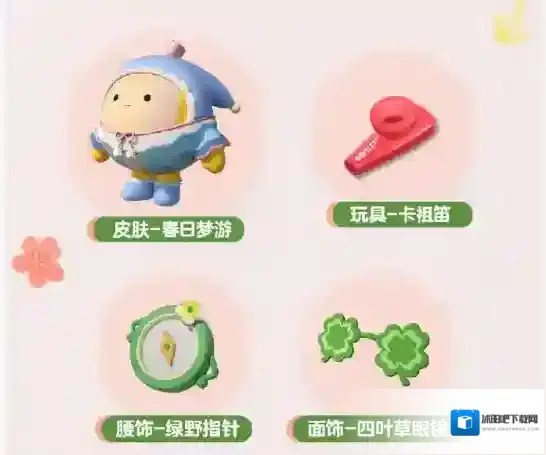 9、4月3日10时起,完成皮蛋节活跃任务获得皮肤-春日梦游、玩具-卡祖笛、腰饰-绿指针、面饰-四叶草眼镜、表情-这就出发、表情-来都来了、表情-吻醒、动作-会心一锤。