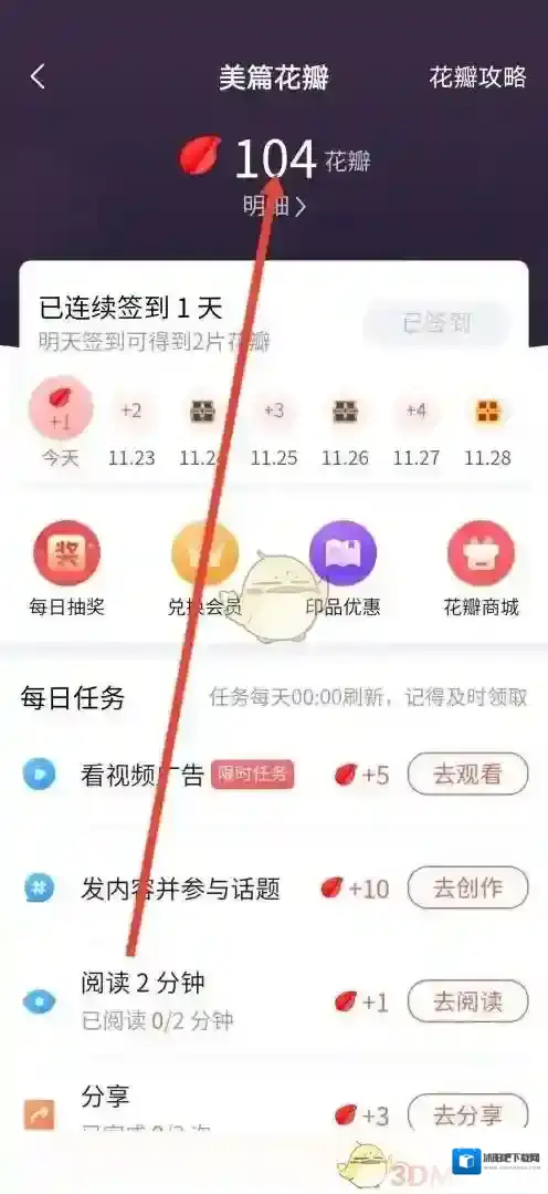 4、最后来到美篇花瓣页面,箭头上数字就是个人花瓣数量了。