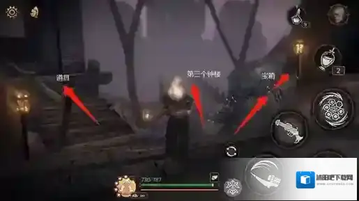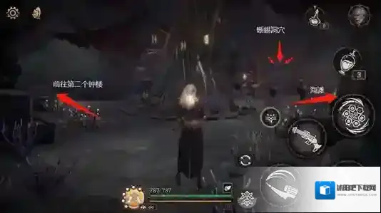 三、推进至岔路口,左侧前往第二个钟楼;直走是蜥蜴洞穴,可开捷径回祭坛;