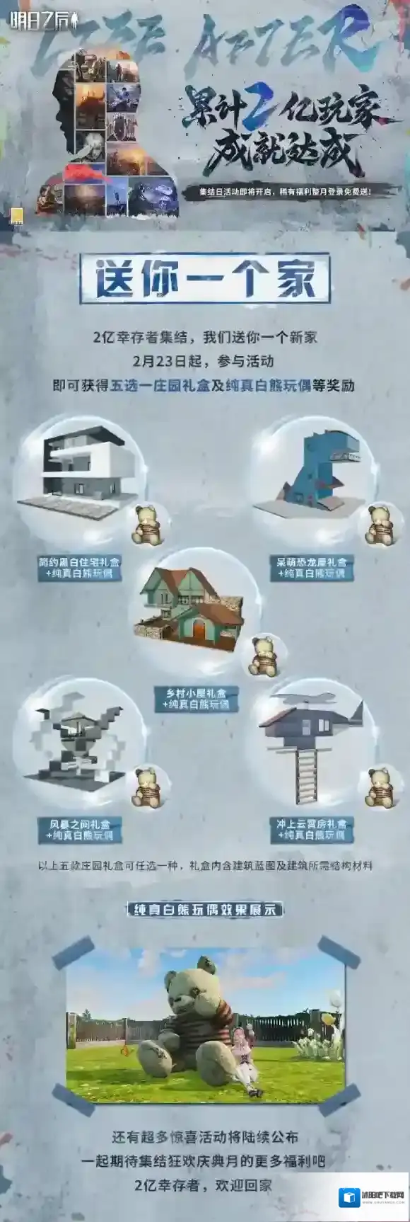 集结狂欢庆典月现已开启,2月23日起,参与活动并邀请好友助力,即可获得自选庄园礼盒及纯真白熊玩偶等奖励,呆萌恐龙屋、风暴之间等多种款式任你选择!