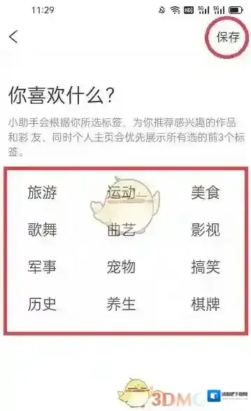 4、页面跳转后,首先点击兴趣标签,然后点击“保存”即可。