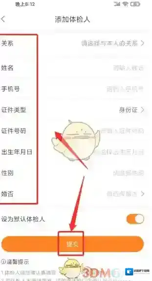 5、打开添加体检人,输入关系、姓名、手机号、证件类型、证件号码、出生年月日、性别、婚否,打开提交。