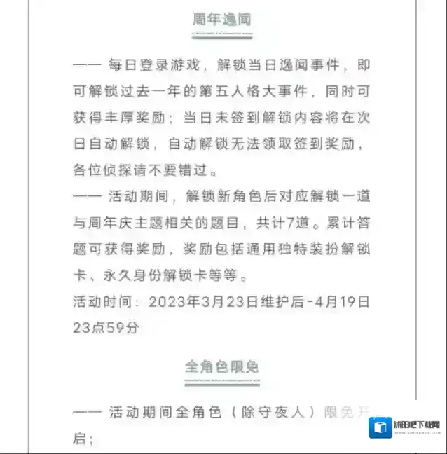 第五人格六周年活动时间 2024年3月28日更新后,开启六周年庆典。第五人格时装 登录赠礼、累计登录奖励更新、全角色限免、限时充值返利、累计充值奖励更新、生日感谢赠礼等福利将陆续向所有达成条件的玩家奉上。第五人格周年庆 第五人格稀世第五人格联动 周年...