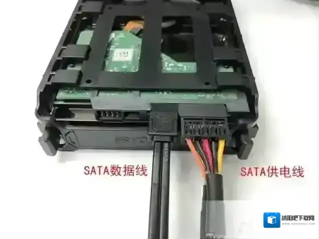 由于SATA接口固态硬盘和机械硬盘接口完全一致,对于SATA接口固态硬盘完全可以参照机械硬盘的接线方法就可以成功安装啦,正好我手上也没有SATA固态硬盘,就用机械硬盘演示吧。拿出SATA数据线,一头插到固态硬盘上,另一头插到主板上SATA接口上即可,再到电脑电源上找到SATA供电线插入就可以了,将固态硬盘安装在机箱的硬盘位上完成安装。