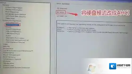 5、注意:切换到system configuration项,如果硬盘模式是raid,将sata operatior硬盘模式改为ahci模式,否则安装win7会同现0x0000007b蓝屏,改了后选择退出并保存BIOS,如下图所示;