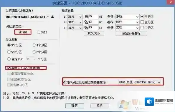 重新分区:磁盘格式转换完成后,点击快速分区,勾选 分区表类型为 MbR ,勾选了重建主引导记录MBR,选择需要分区的个数以及大小,当然大家可以点击“自定”来设置合适的分区,按下确定后开始分区(如果是固态硬盘或者是东芝的硬盘要进行4K对齐一下),如下图: