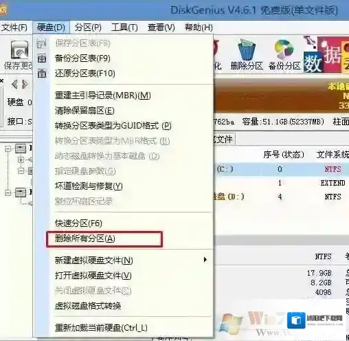 2、打开桌面上的Diskgenius分区工具(DG分区工具);打开Diskgenius后,选择笔记本硬盘,然后点击“硬盘”,查看菜单中的“转换分区表类型为MBR格式”选项是否灰色,如果是灰色的话那么我们就无需进行重新分区,除了C盘系统盘和桌面上的资料,重装系统后其他磁盘中的资料都不会被清空,如果“转换分区表类型为MBR格式”选项是可选的,则需要将整个硬盘格式化,操作方法如下:删除分区:点击“硬盘”–“删除所有分区”,删除前确保资料已经转移,删除后,点击保存更改,如图:
