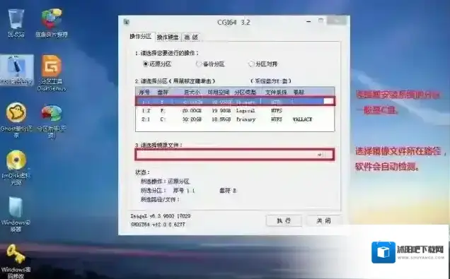 2、过劲行CGI备份还原,找到你的Win7或Win10系统安装镜象,然后安装到C盘就可以了!