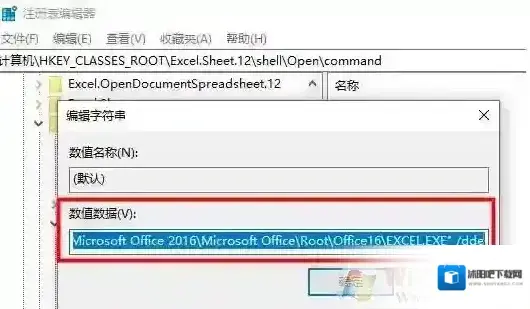 2. 找要修改的位置: HKEY_CLASSES_ROOTExcel.Sheet.12shellOpencommand 后在右边蓝色粗线框中默认上双击;也可直接复制这个位置,粘贴到图中红色粗线框的位置后回车。