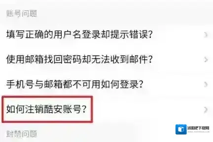 6、在常见问题列表中,找到并点击“如何注销酷安账号”或类似选项。
