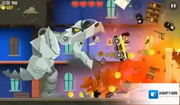 沿途除了亲力亲为地制造“事故”之外,还可以挤压炸药桶来引发一系列的连锁摧毁效应,只要能够消灭敌人,即便家园民房破坏殆尽也不会觉得可惜。需要注意的是,如果在行进途中长时间卡在一个地方的话就会被追赶上来的机械恐龙吃掉,可谓前有强敌后有追兵,紧张刺激感满地铺开。