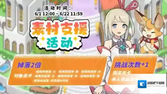 ◇ 6月1日,「素材支援」活动开启,部分关卡角色培育素材掉落翻倍,单人挑战关卡每日挑战次数+1!