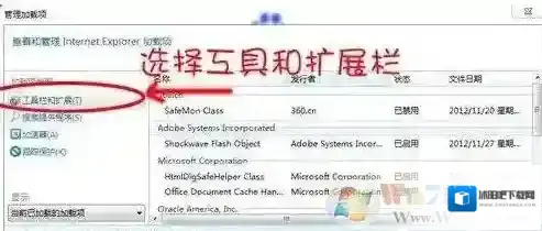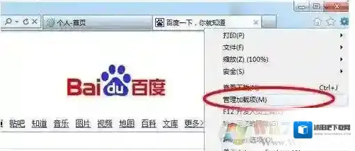 第三步,打开IE的管理加载项。打开IE浏览器,点击右上角的设置按钮,进入管理加载项,进入加载项的选择界面。