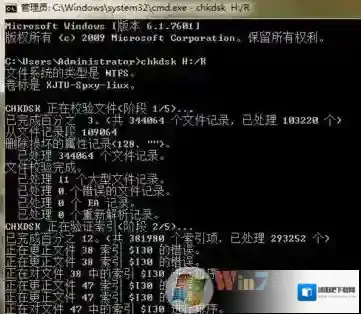 4、然后系统就开始对损坏的移动硬盘进行修复,如果硬盘中文件较多的话,修复过程可能会比较长,如图所示。