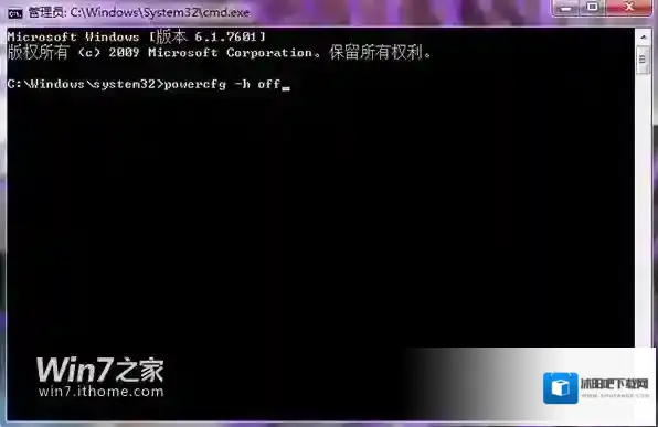 2、然后输入关闭休眠命令: powercfg -h off 回车