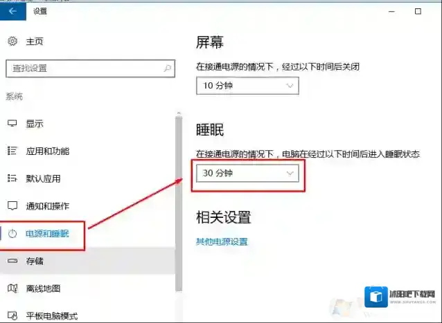 3、选择电源和睡眠。将睡眠时间选择为从不即可。