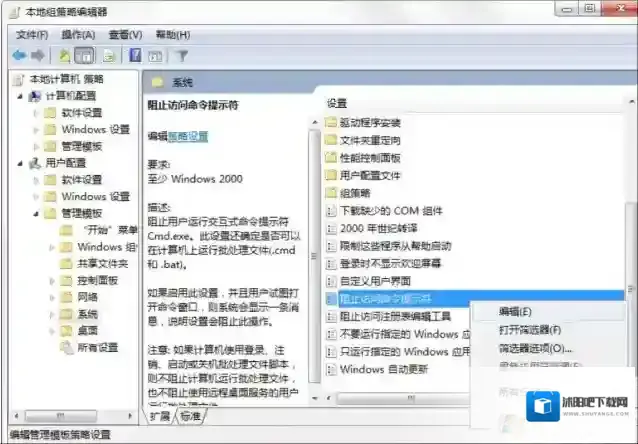 3、在系统项目的右侧窗口右击“阻止访问命令提示符”,单击“编辑”按钮;