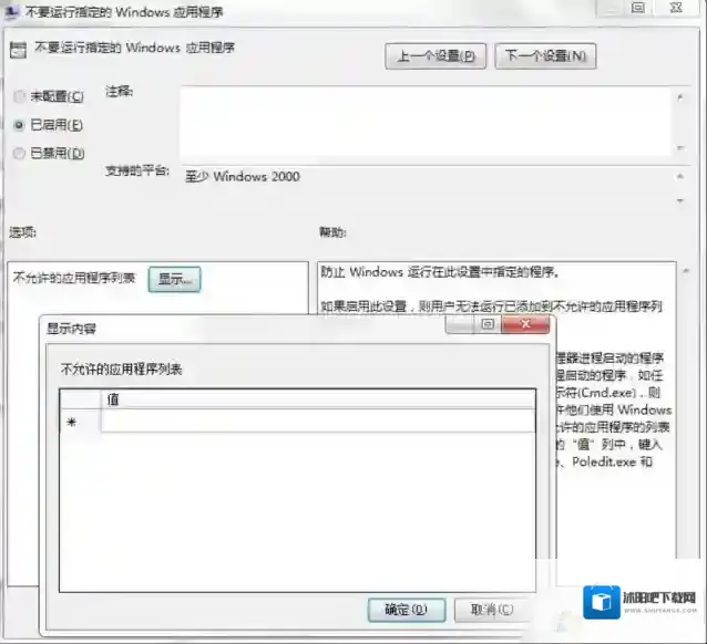 6、启用,然后在不允许的应用程序中输入 cmd.exe,确定;